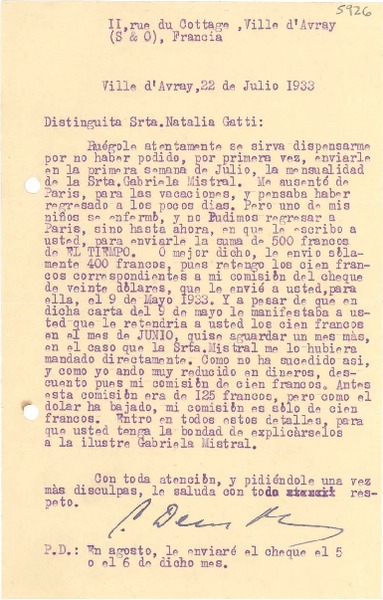 [Carta] 1933 jul. 22, Ville D'Avray, Francia [a] Natalia Gatti [manuscrito] Carlos Deambrosis Martins.
