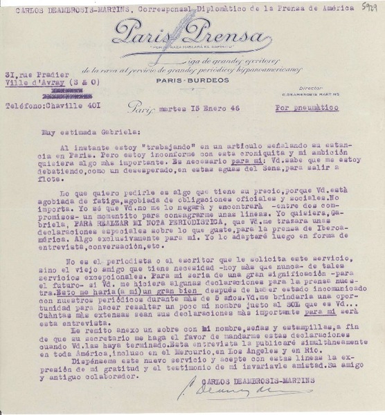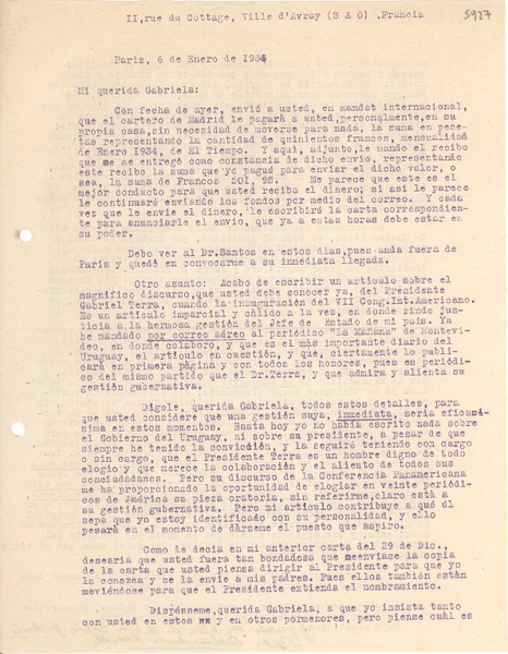 [Carta] 1934 ene. 6, Paris, Francia [a] Gabriela [Mistral] [manuscrito] Carlos Deambrosis Martins.