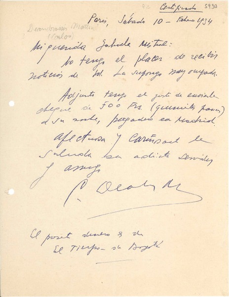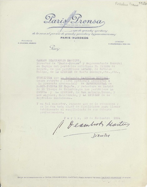 [Carta] 1934 feb. 10, Paris, [Francia] [a] Gabriela Mistral [manuscrito] [Carlos] Deambrosis Martins.