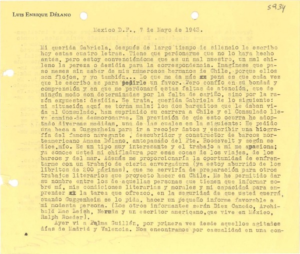 [Carta] 1943 mayo 7, México D.F. [a] Gabriela [Mistral] [manuscrito] Luis Enrique Délano.