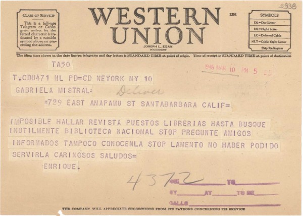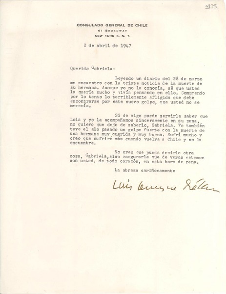 [Carta] 1947 abr. 2, New York [a] Gabriela Mistral [manuscrito] Luis Enrique Délano.
