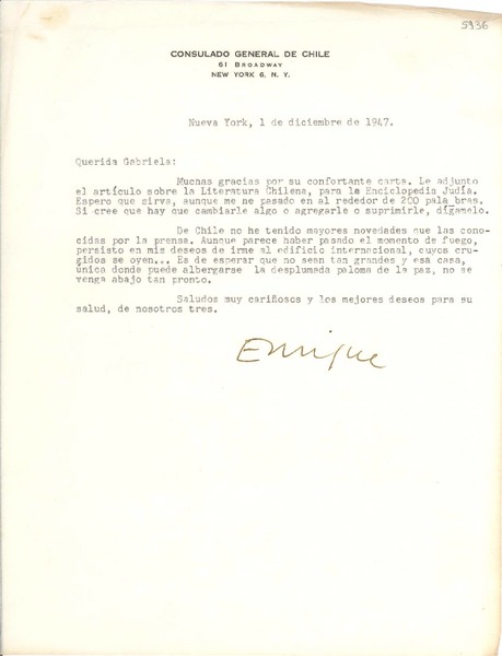 [Carta] 1947 dic. 1, New York [a] Gabriela Mistral [manuscrito] Luis Enrique Délano.
