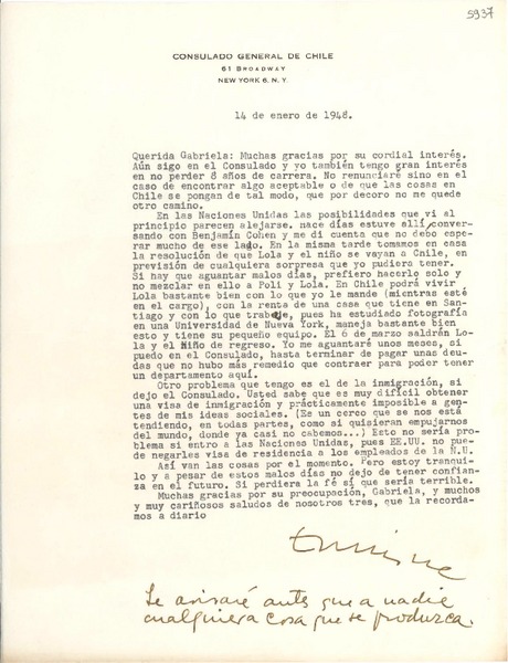 [Carta] 1948 ene. 14, New York [a] Gabriela Mistral [manuscrito] Luis Enrique Délano.
