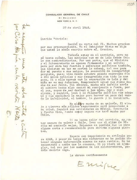 [Carta] 1948 abr. 27, New York [a] Gabriela Mistral [manuscrito] Luis Enrique Délano.