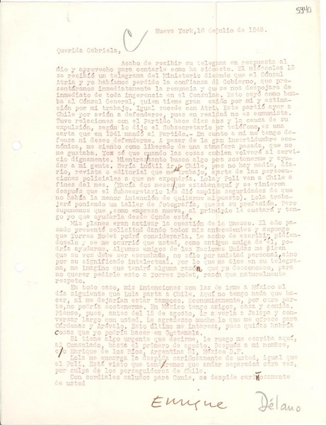 [Carta] 1949 jul. 16, Nueva York [a] Gabriela Mistral [manuscrito] Luis Enrique Délano.