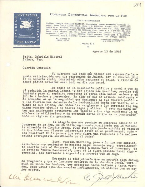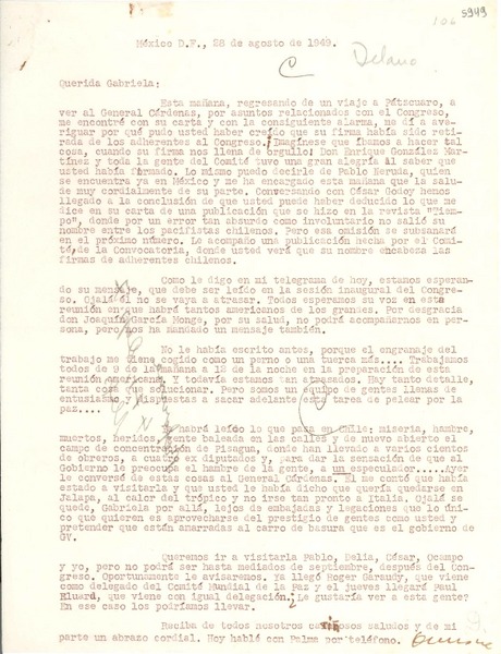 [Carta] 1949 ago. 28, México D. F. [a] Gabriela Mistral [manuscrito] Luis Enrique Délano.