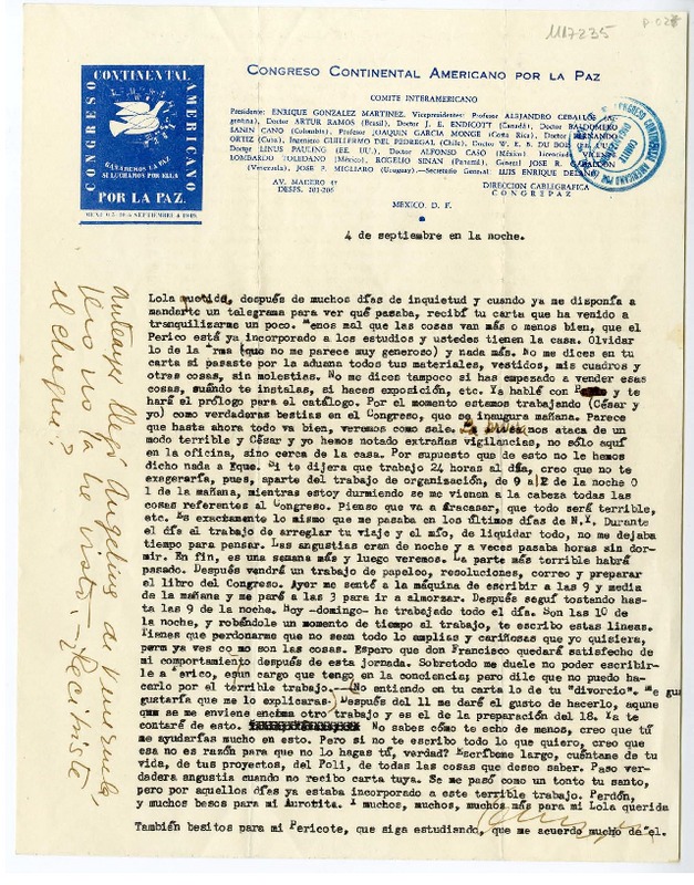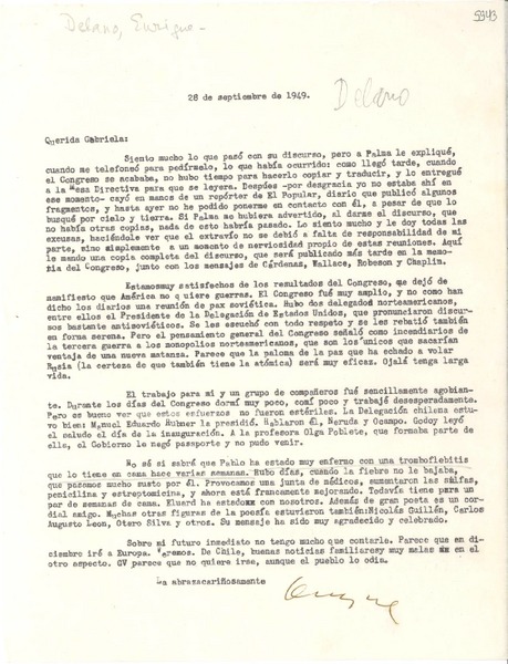 [Carta] 1949 sept. 28, [México D. F.] [a] Gabriela Mistral [manuscrito] Luis Enrique Délano.