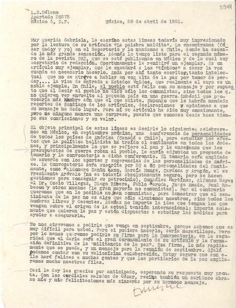 [Carta] 1951 abr. 28, México D. F. [a] Gabriela Mistral [manuscrito] Luis Enrique Délano.