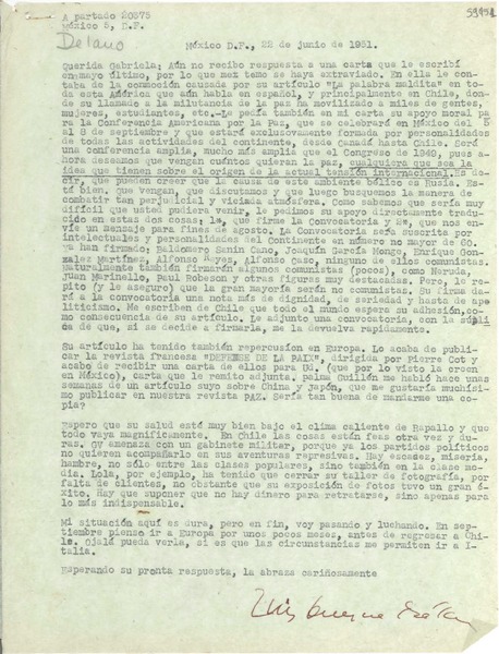 [Carta] 1951 jun. 22, México D. F. [a] Gabriela Mistral [manuscrito] Luis Enrique Délano.