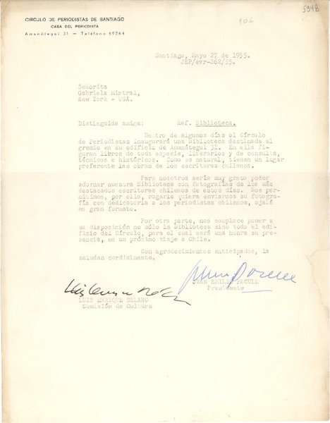 [Carta] 1955 mayo 27, Santiago [a] Gabriela Mistral, New York [manuscrito] Luis Enrique Délano.