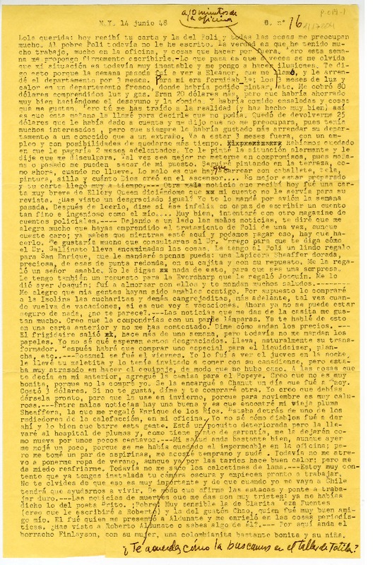 [Carta] 1948 junio 14, Nueva York [a] Lola Falcón [manuscrito] Luis Enrique Délano.