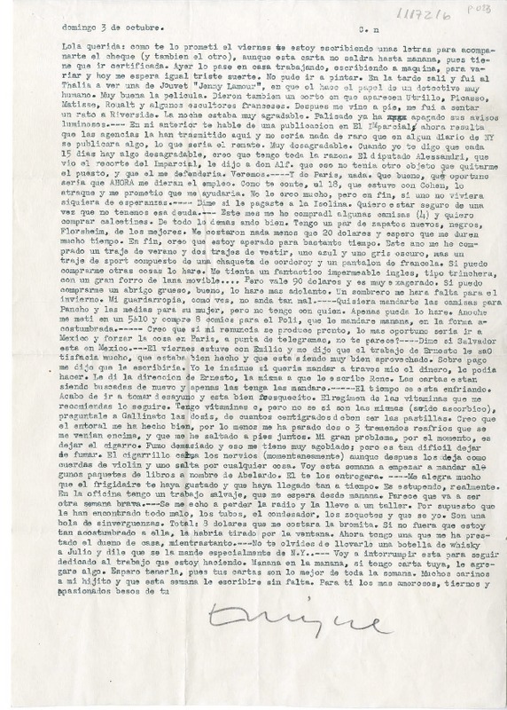 [Carta] [1948] octubre 3, [Nueva York] [a] Lola Falcón [manuscrito] Luis Enrique Délano.
