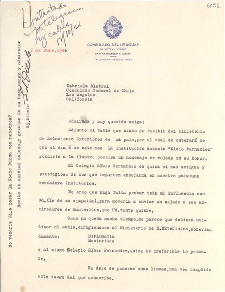 [Carta] 1946 dic. 5, [San Francisco, California] [a] Gabriela Mistral, Los Ángeles [manuscrito] Eduardo Dieste.