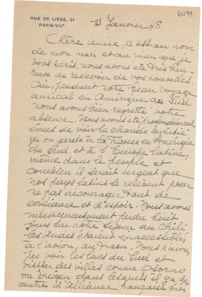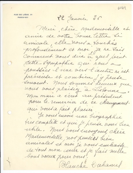 [Carta] 1936 ene. 22, Paris, [Francia] [a] [Gabriela Mistral] [manuscrito] Blanche Duhamel.