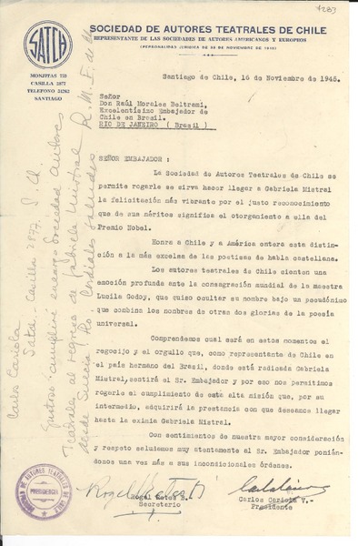 [Carta] 1945 nov. 16, Santiago, Chile [a] Raúl Morales Beltraní, Rio de Janeiro [manuscrito] Carlos Cariola V., Rogel Retes B.