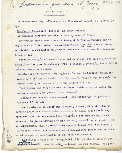 Novela autobiográfica chilena - Manuscritos chilenos - Juicios, procesos, etc - Larraín Echeverría, Rebeca