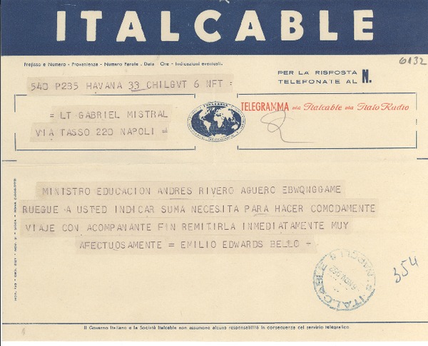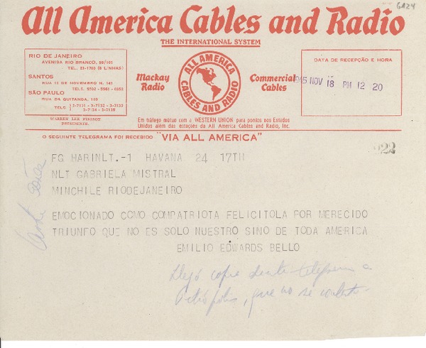 [Telegrama] 1945 nov. 18, [La] Habana, [Cuba] [a] Gabriela Mistral, Rio de Janeiro [manuscrito] [Emilio] Edwards Bello.