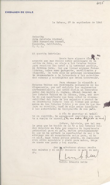 [Carta] 1946 sept. 27, La Habana, [Cuba] [a] Gabriela Mistral, Monrovia, California [manuscrito] Emilio Edwards Bello.