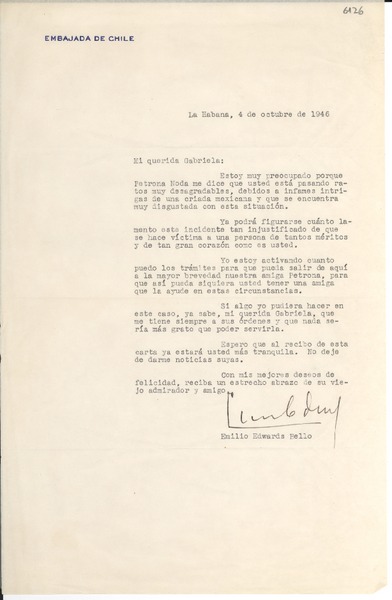 [Carta] 1946 oct. 4, La Habana, [Cuba] [a] Gabriela Mistral [manuscrito] Emilio Edwards Bello.