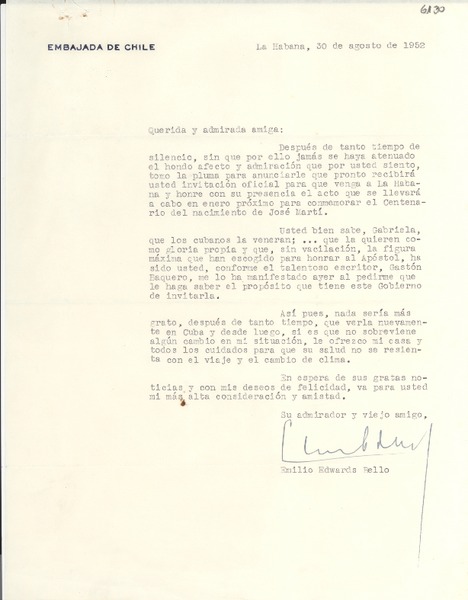 [Carta] 1952 ago. 30, La Habana, [Cuba] [a] [Gabriela Mistral] [manuscrito] Emilio Edwards Bello.