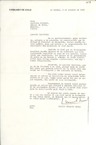 [Carta] 1952 oct. 9, La Habana, [Cuba] [a] Gabriela Mistral, Nápoles, Italia [manuscrito] Emilio Edwards Bello.