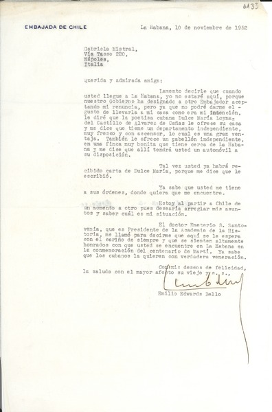 [Carta] 1952 nov. 9, La Habana, [Cuba] [a] Gabriela Mistral, Nápoles, [Italia] [manuscrito] Emilio Edwards Bello.
