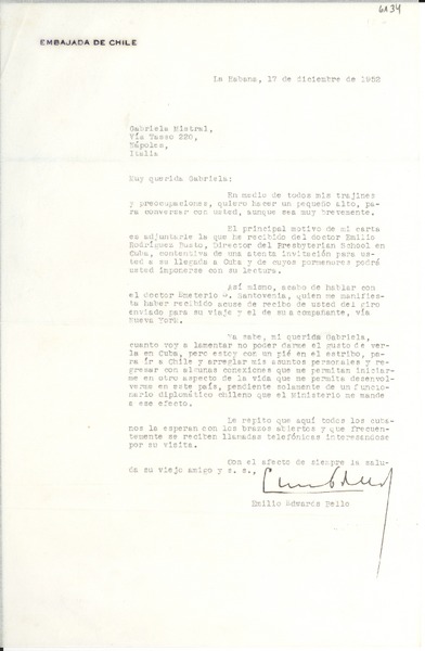 [Carta] 1952 dic. 17, La Habana, [Cuba] [a] Gabriela Mistral, Nápoles, Italia [manuscrito] Emilio Edwards Bello.