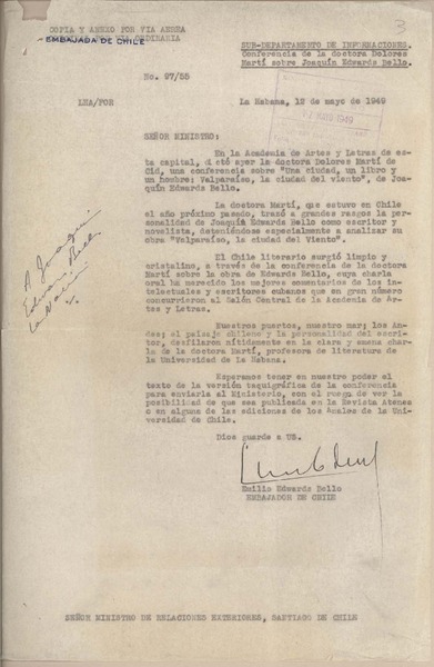[Oficio N° 9755] 1949 mayo 12, La Habana, [Cuba] [al] Señor Ministro de Relaciones Exteriores, Santiago de Chile [manuscrito] / Emilio Edwards Bello.