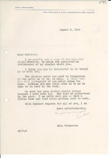 [Carta] 1942 ago. 8, Albuquerque, New Mexico [a] Gabriela Mistral [manuscrito] Erna Fergusson.