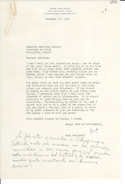 [Carta] 1945 dic. 10, Albuquerque, New Mexico [a] Gabriela Mistral, Petrópolis, Brasil [manuscrito] Erna Fergusson.
