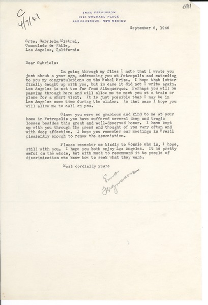 [Carta] 1946 sept. 6, Albuquerque, New Mexico [a] Gabriela Mistral, Los Ángeles, California [manuscrito] Erna Fergusson.