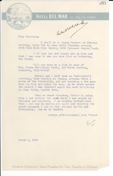 [Carta] 1948 mar. 1, California [a] Gabriela Mistral [manuscrito] Erna Fergusson.