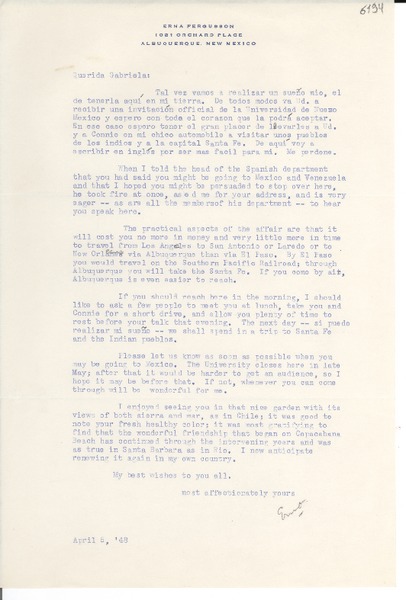 [Carta] 1948 abr. 6, Albuquerque, New Mexico [a] Gabriela Mistral [manuscrito] Erna Fergusson.