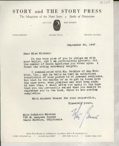 [Carta] 1947 Sept. 9, New York, [EE.UU.] [a] Gabriela Mistral, Santa Barbara, California, [EE.UU.] [manuscrito] Whit Burnett.