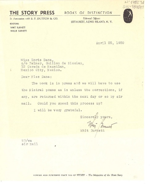 [Carta] 1950 apr. 25, Long Island, New York, [Estados Unidos] [a] Doris Dana co Palmer Guillon de Nicolau [sic], Mexico City, Mexico [manuscrito] / Whit Burnett.