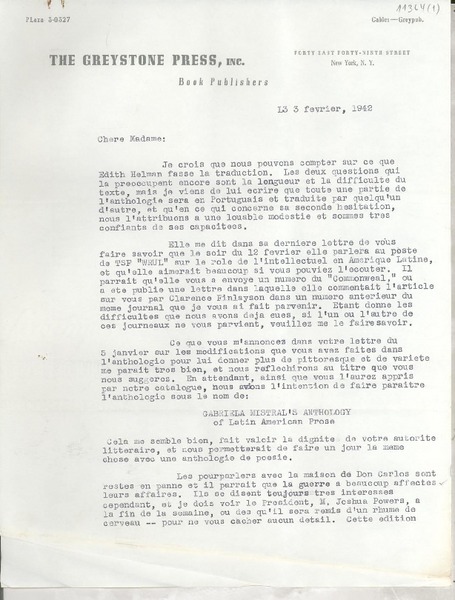 [Carta] 1942 févr. 3, New York, [EE.UU.] [a] Gabriela Mistral, Petropolis, Brazil [manuscrito] Arné H. Ekstrom.