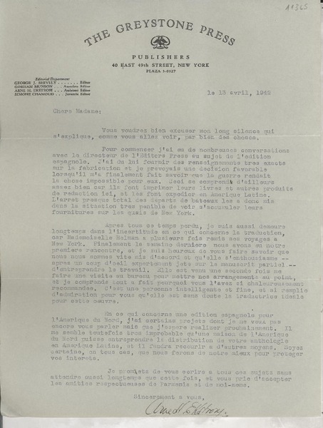 [Carta] 1942 avril 13, New York, [EE.UU.] [a] [Gabriela Mistral] [manuscrito] Arné H. Ekstrom.