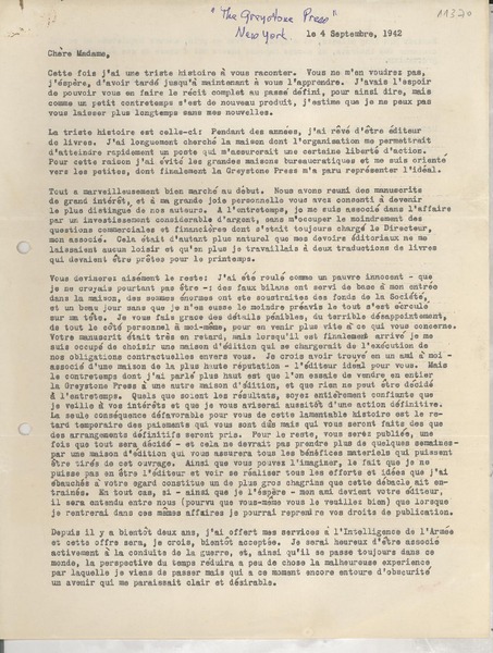 [Carta] 1942 sept. 4, New York, [EE.UU.] [a] Gabriela Mistral, Petropolis, Bresil [manuscrito] Arné H. Ekstrom.