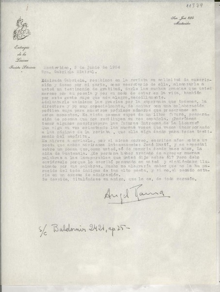 [Carta] 1954 jun. 3, Montevideo [a] Gabriela Mistral [manuscrito] Angel Rama.