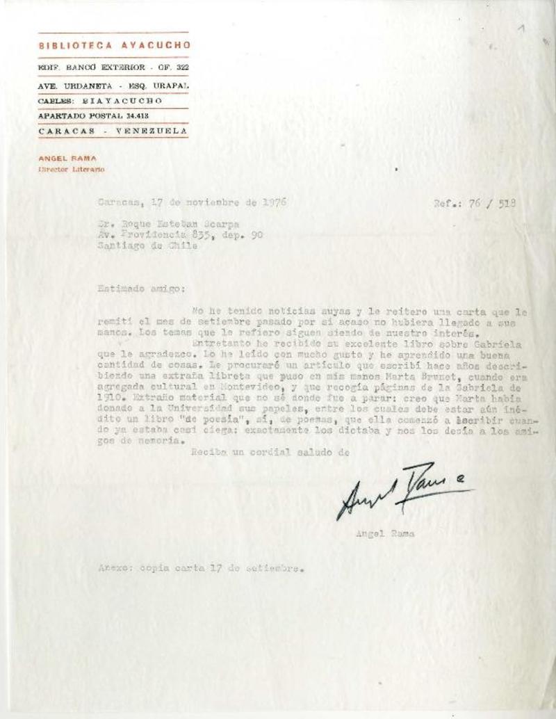 Caracas, Venezuela [a] Roque Esteban Scarpa, Chile carta, 1976 noviembre 17, [manuscrito] Ángel Rama.
