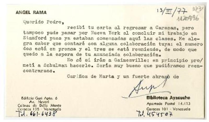 Caracas, Venezuela [a] Pedro Lastra, New York Tarjeta, 13 de marzo 1977, [manuscrito] Ángel Rama.