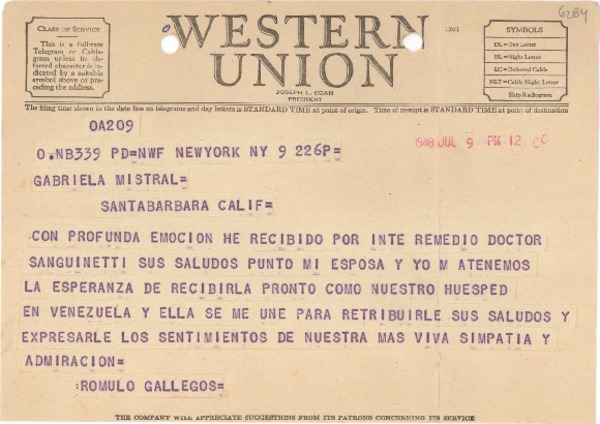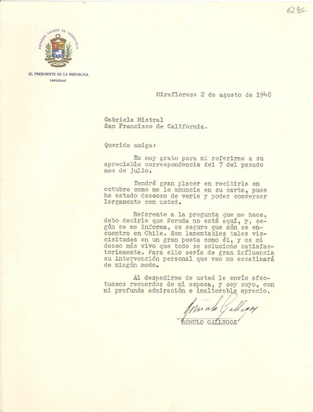 [Carta] 1948 ago. 2, Venezuela [a] Gabriela Mistral, San Francisco, California [manuscrito] Rómulo Gallegos.