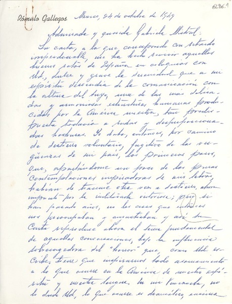 [Carta] 1949 oct. 24, México [a] Gabriela Mistral [manuscrito] Rómulo Gallegos.