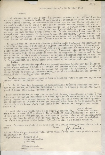 [Carta] 1946 mai 20, Ostrava, Checoslovaquia [a] Gabriela Mistral [manuscrito] Zdenêk Smíd.