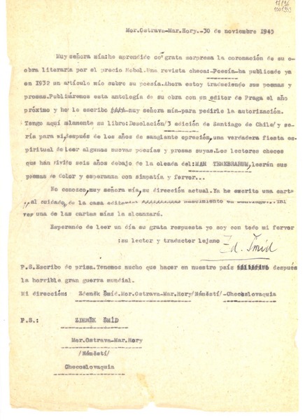 [Carta] 1945 nov. 30, Ostrava, Checoslovaquia [a] Gabriela Mistral [manuscrito] Zdenêk Smíd.