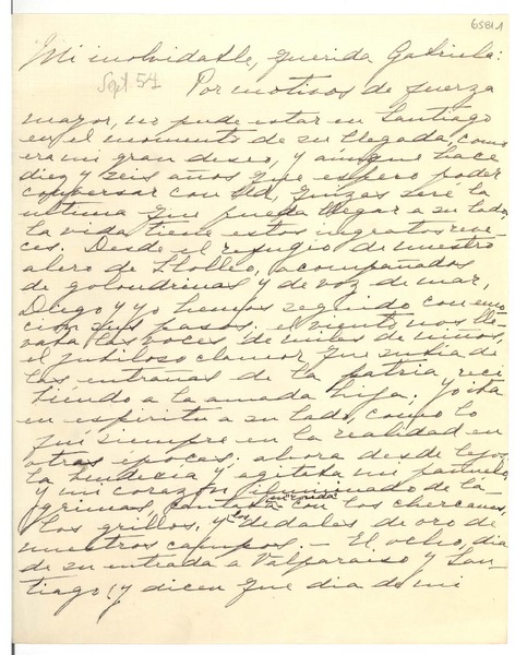 [Carta] 1954 sept., Santiago, [Chile] [a] Gabriela [Mistral] [manuscrito] Mercedes Huidobro de Dublé.