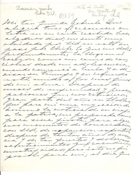 [Carta] 1954 dic., Santiago, [Chile] [a] Gabriela [Mistral] [manuscrito] [Mercedes Huidobro de Dublé].