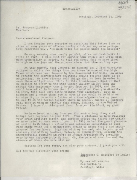 [Carta] 1965 Dec. 15, Santiago, Chile [a] Sr. Jacques Lipchitz, New York [manuscrito] Mercedes G. Huidobro de Dublé.