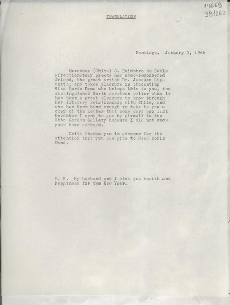 [Carta] 1966 Jan. 3, Santiago, Chile [a] Jacques Lipchitz [manuscrito] Mercedes G. Huidobro de Dublé.