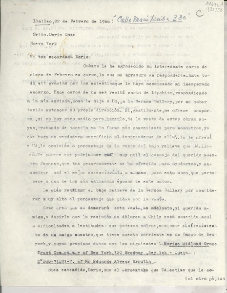 [Carta] 1966 feb. 22, Calle María Luisa 380, Llolleo, [Chile] [a la] Srta. Doris Dana, Nueva York, [EE.UU.] [manuscrito] Mercedes G. Huidobro de Dublé.